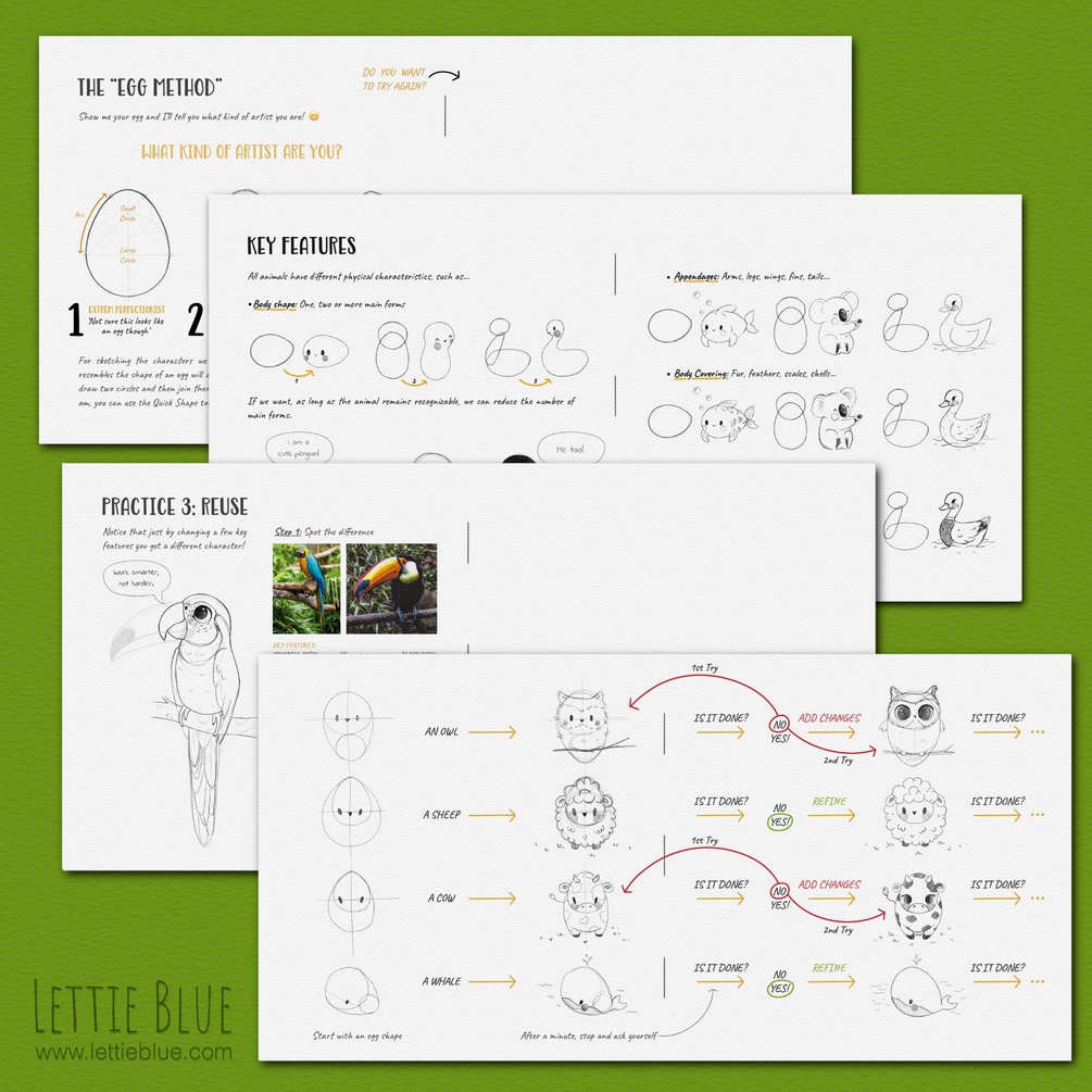 Workbook 2 (available): Tips to make our characters more interesting. First steps to adding personality. In this second workbook, we'll dive into the shape language and how to use asymmetry to add personality to our characters. We will learn to be more creative, play with proportions and draw our character from a different perspective. https://lettieblue.gumroad.com/l/CuteEasyCharactersW2LB