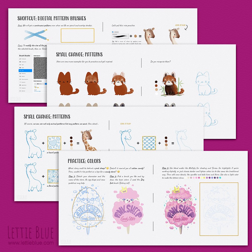 Workbook 4 (This Product): Tips to make our characters unique. Quirks, colors & patterns. In this forth workbook, we will dive into color and patterns, and learn how to apply them to make our character unique. Tips on Procreate pattern brushes included!
