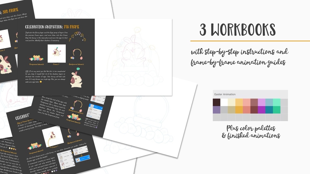 • Advanced Easy Workbook: 14 pages of step-by-step instructions. Cute character: a bunny. Animation style: a fun celebration animation (with jumping and waving).