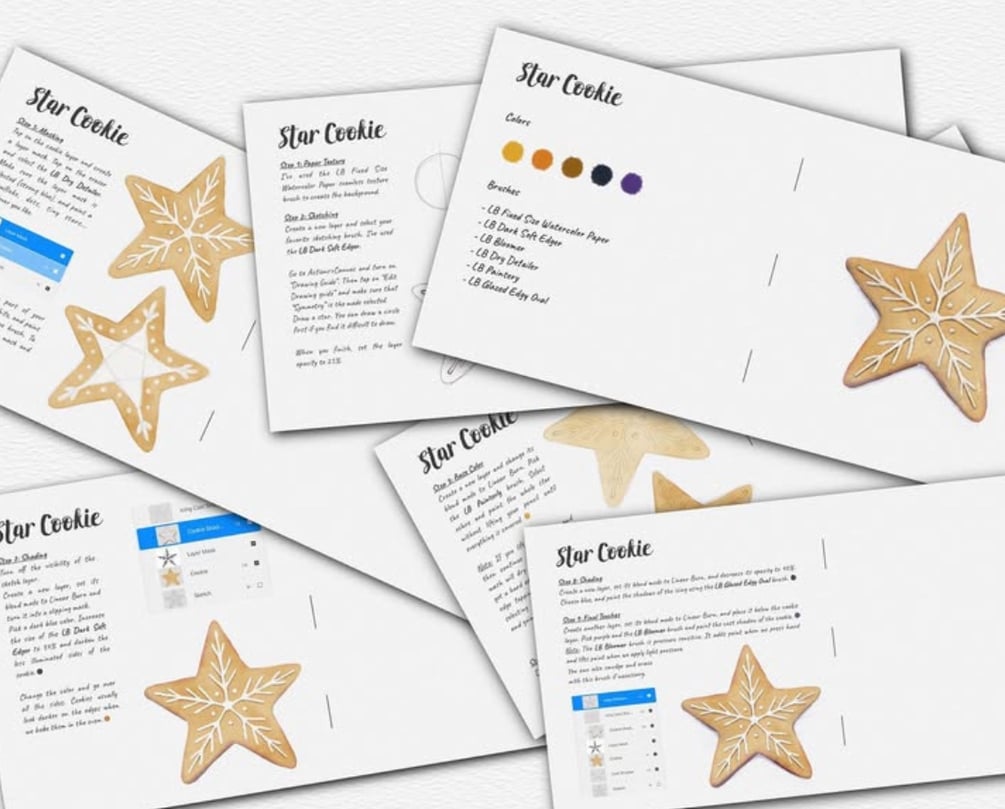 This workbook includes a step-by-step written tutorial on how to paint a watercolor star cookie in Procreate.