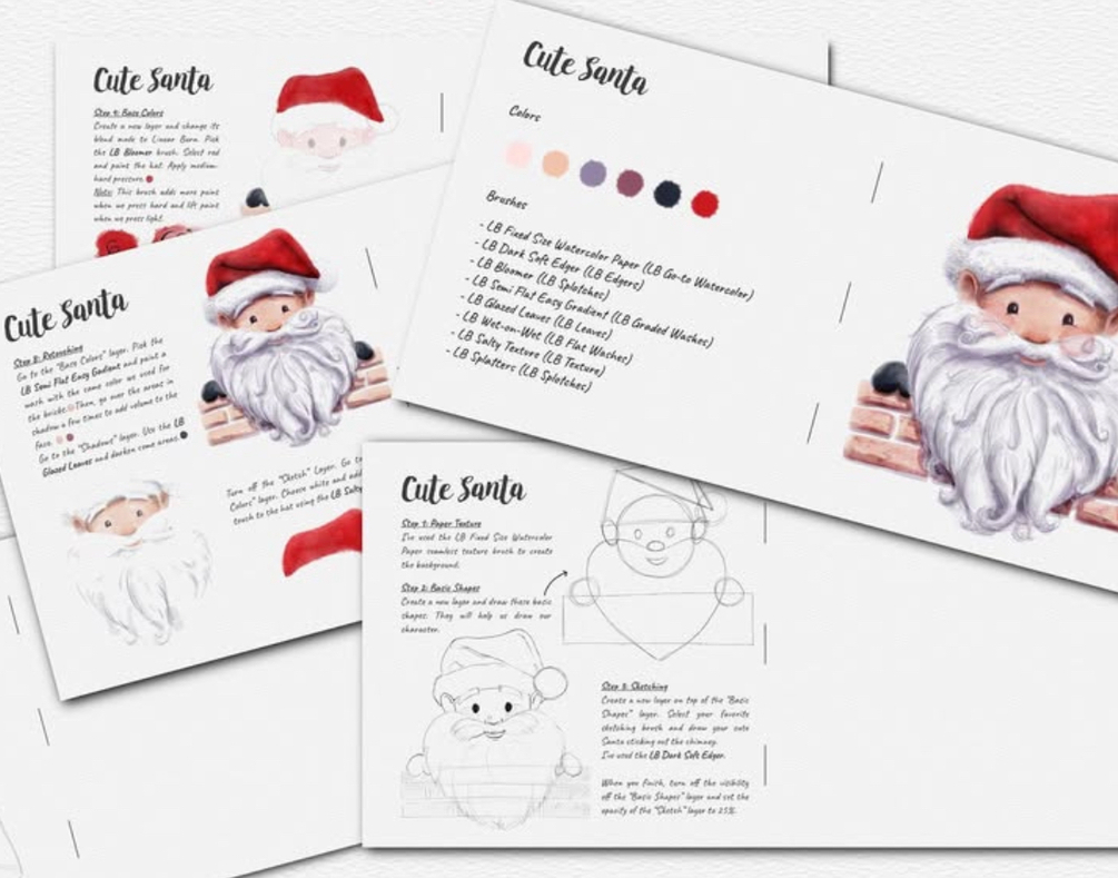 This workbook includes a step-by-step written tutorial on how to paint a cute watercolor Santa in Procreate.